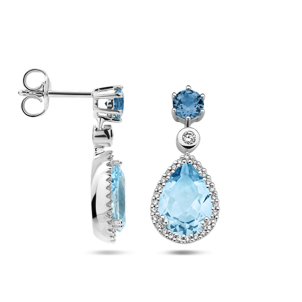 14k Witgouden oorhangers uitgevoerd met london blue topaas, blauw topaas en diamanten. De oorhangers hebben een totale hoogte van 21mm.