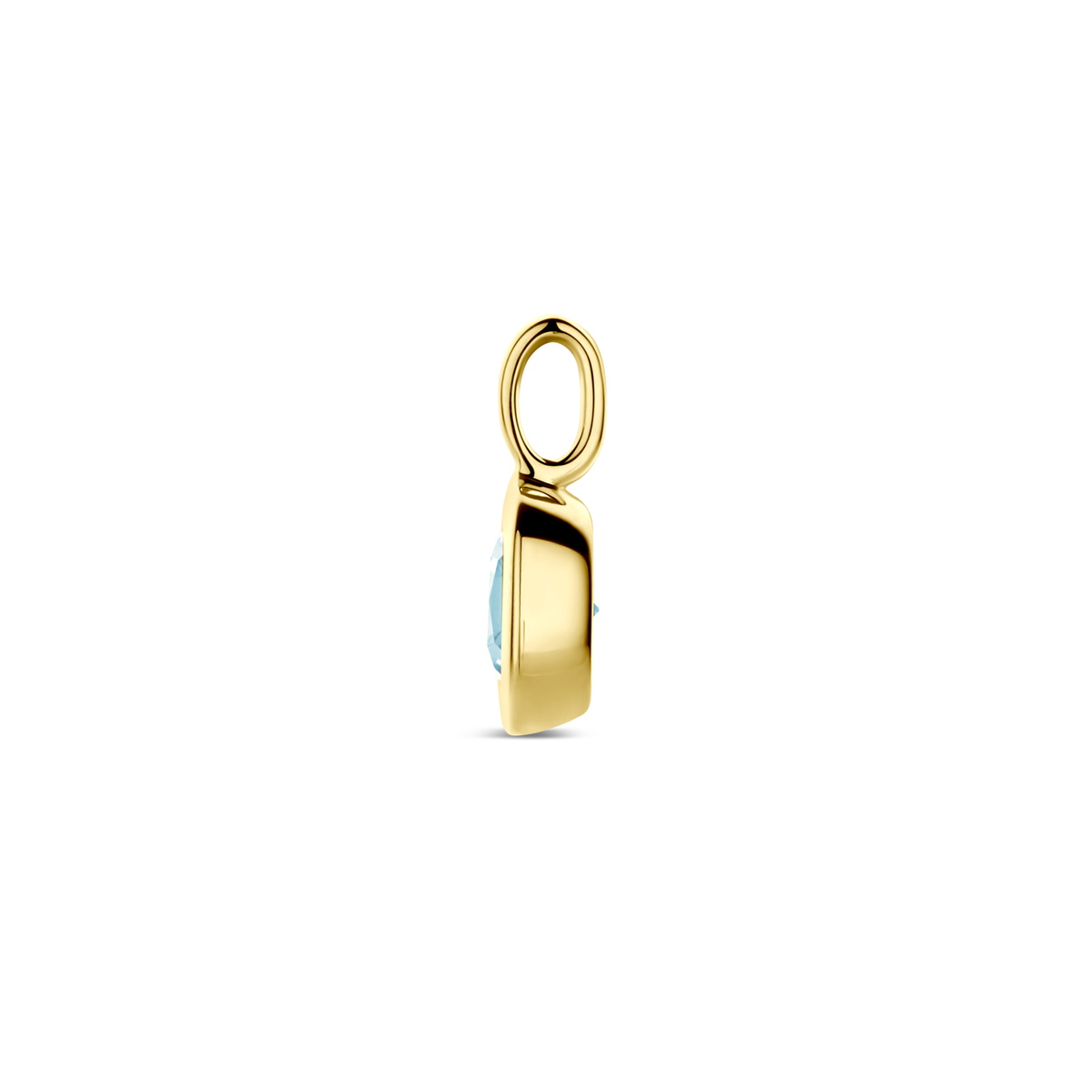 14k Geelgouden hanger uitgevoerd met sky blue topaas. De hanger heeft een totale hoogte van 14mm.