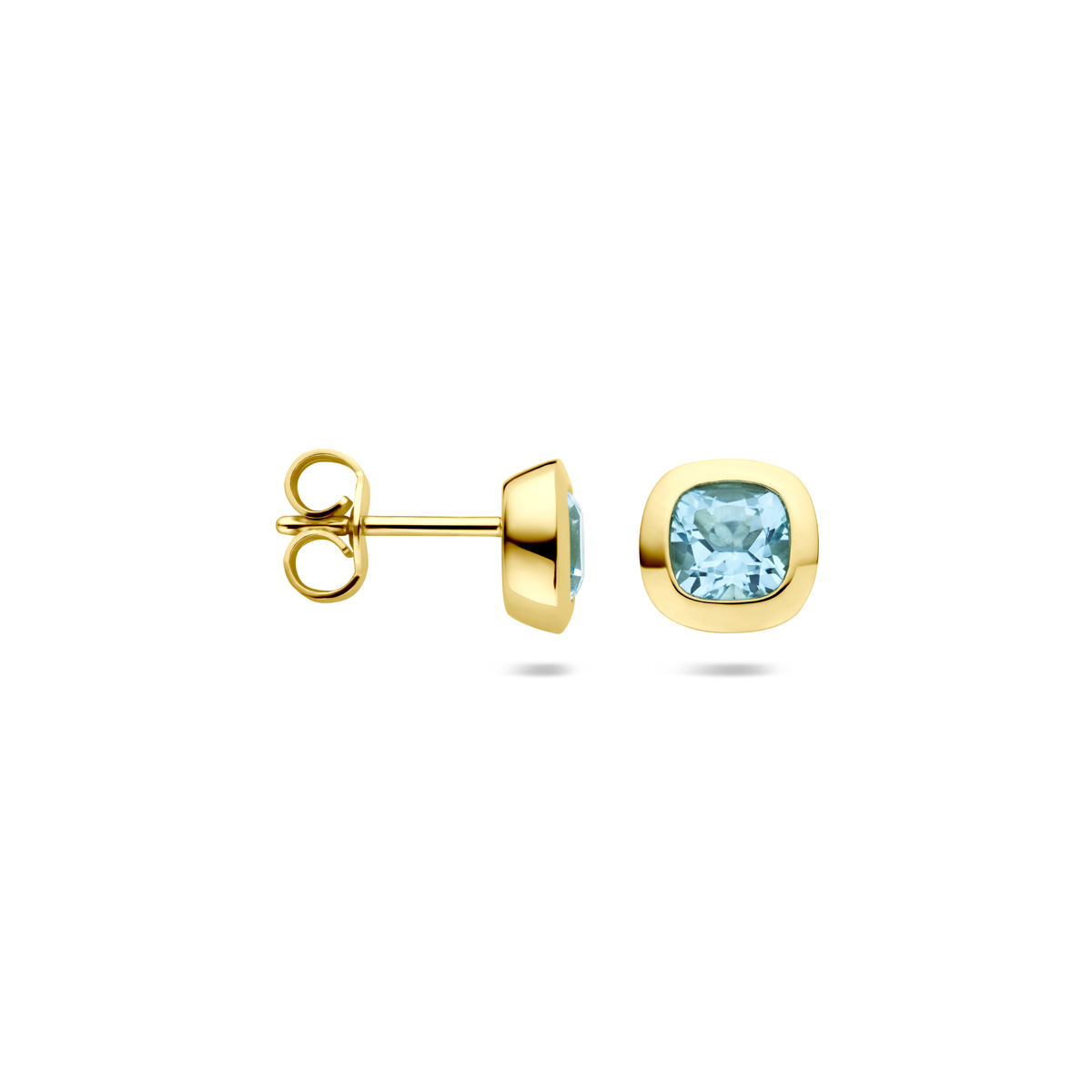 14k Geelgouden oorknoppen uitgevoerd met sky blue topaas. De oorknoppen hebben een afmeting van 7.5x7.5mm