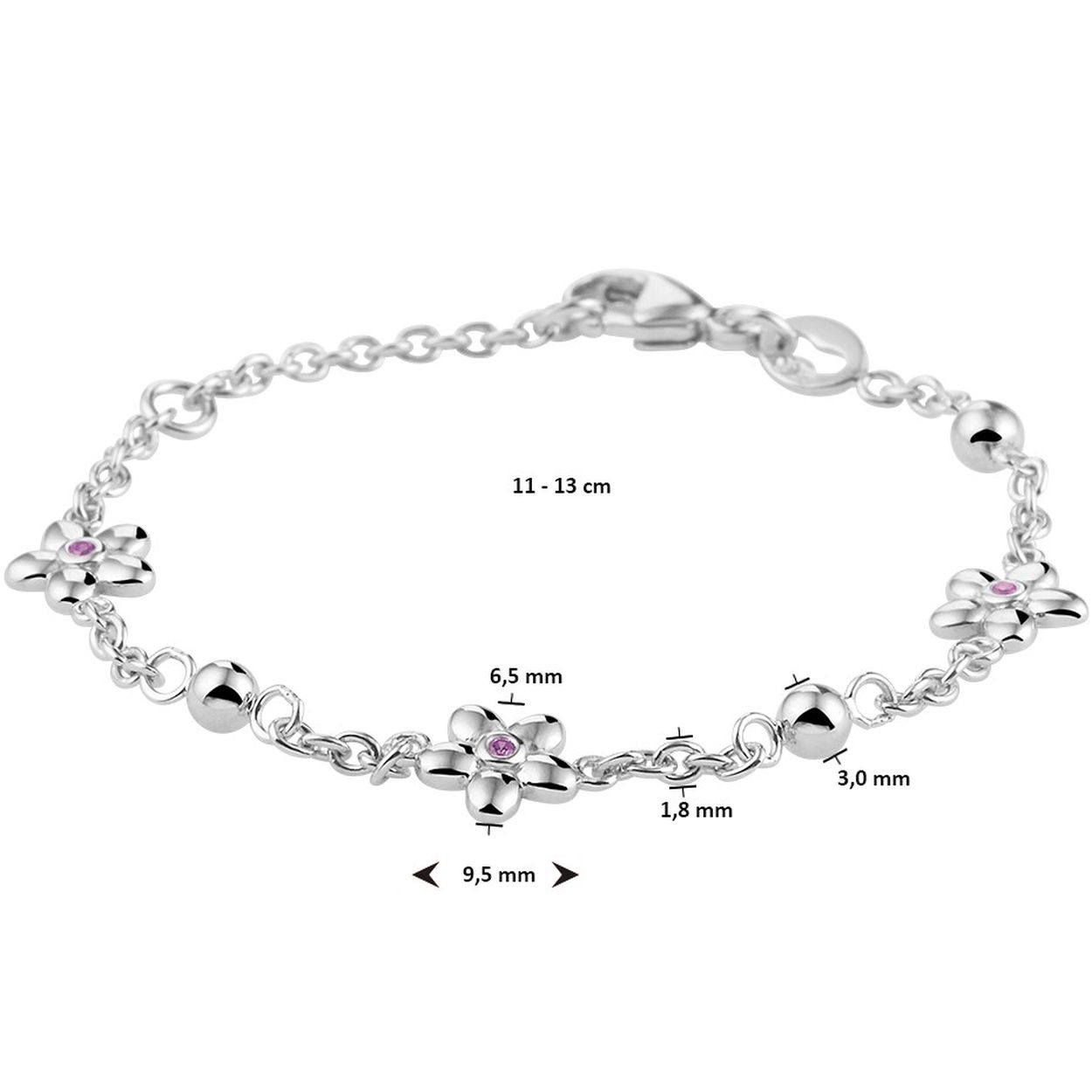 Gerhodineerd 925 zilveren armband uitgevoerd met leuke bloemen met daarin een roze zirkonia. De armband heeft draaglengtes van 11 tot 13cm en een stevige karabijn sluiting. De bloemen hebben een afmeting van 6.5x9.5mm.