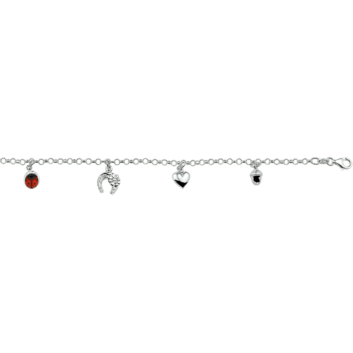 Zilveren jasseron armband met een lengte van 17cm uitgevoerd met 4 diverse bedels in een lichte uitvoering. De armband is ook te verkrijgen in een zware uitvoering art. 10.08918.