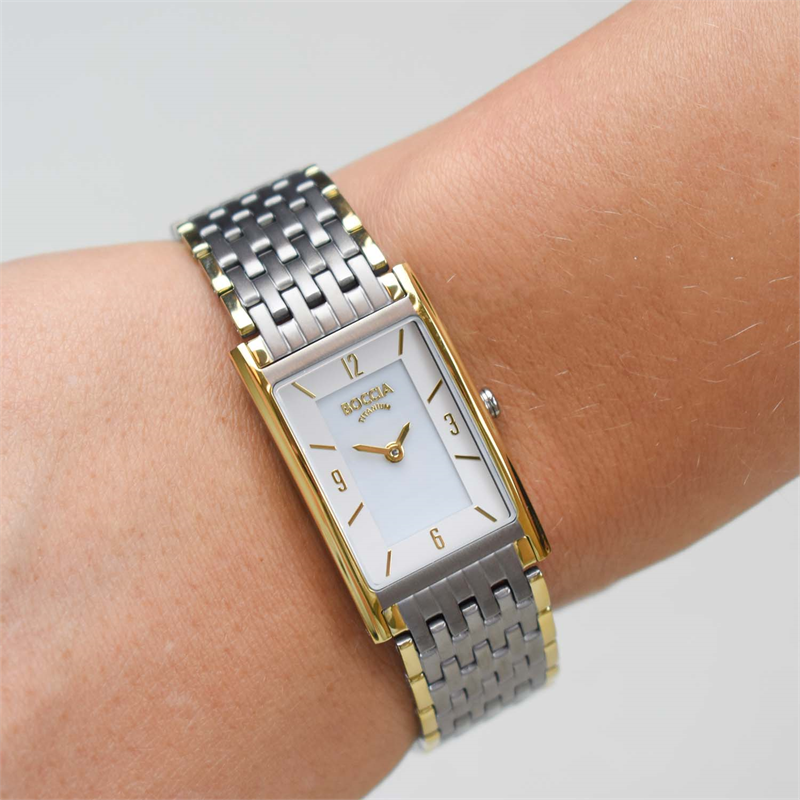 Dit dameshorloge van Boccia Titanium heeft een nette uitstraling. De tweekleurige rechthoekige horlogekast zorgt voor een stijlvolle look en de parelmoer wijzerplaat maakt het horloge net wat meer chique. Het horloge heeft een rechthoekige kast met een diameter van 21mm, een mineraalglas en is 5ATM. Combineer dit prachtige exemplaar met de andere sieraden van Boccia Titanium voor een complete look. Aan de titanium kast zit een titanium fijne bi-color schakel band.