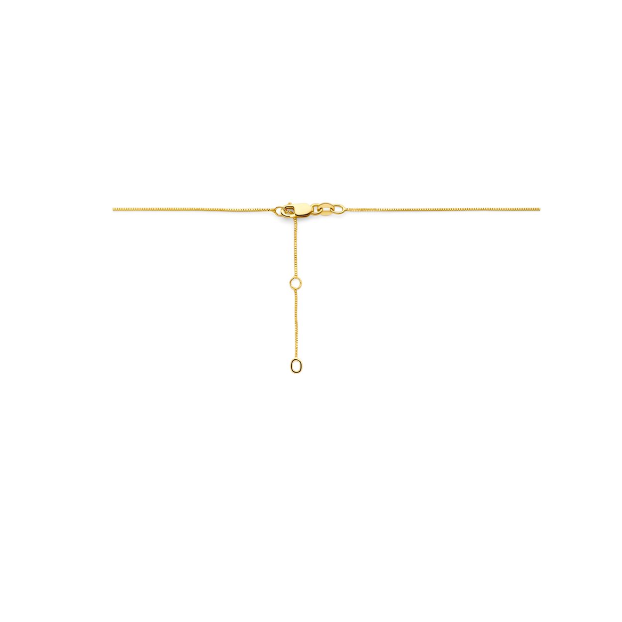 14k Geelgouden collier uitgevoerd met roze topaas en diamant. Het collier heeft draaglengtes van 40-42-44cm en is uitgevoerd met karabijnsluiting. De schakelbreedte is 0.6mm. Het diamantgewicht is 0.11ct.