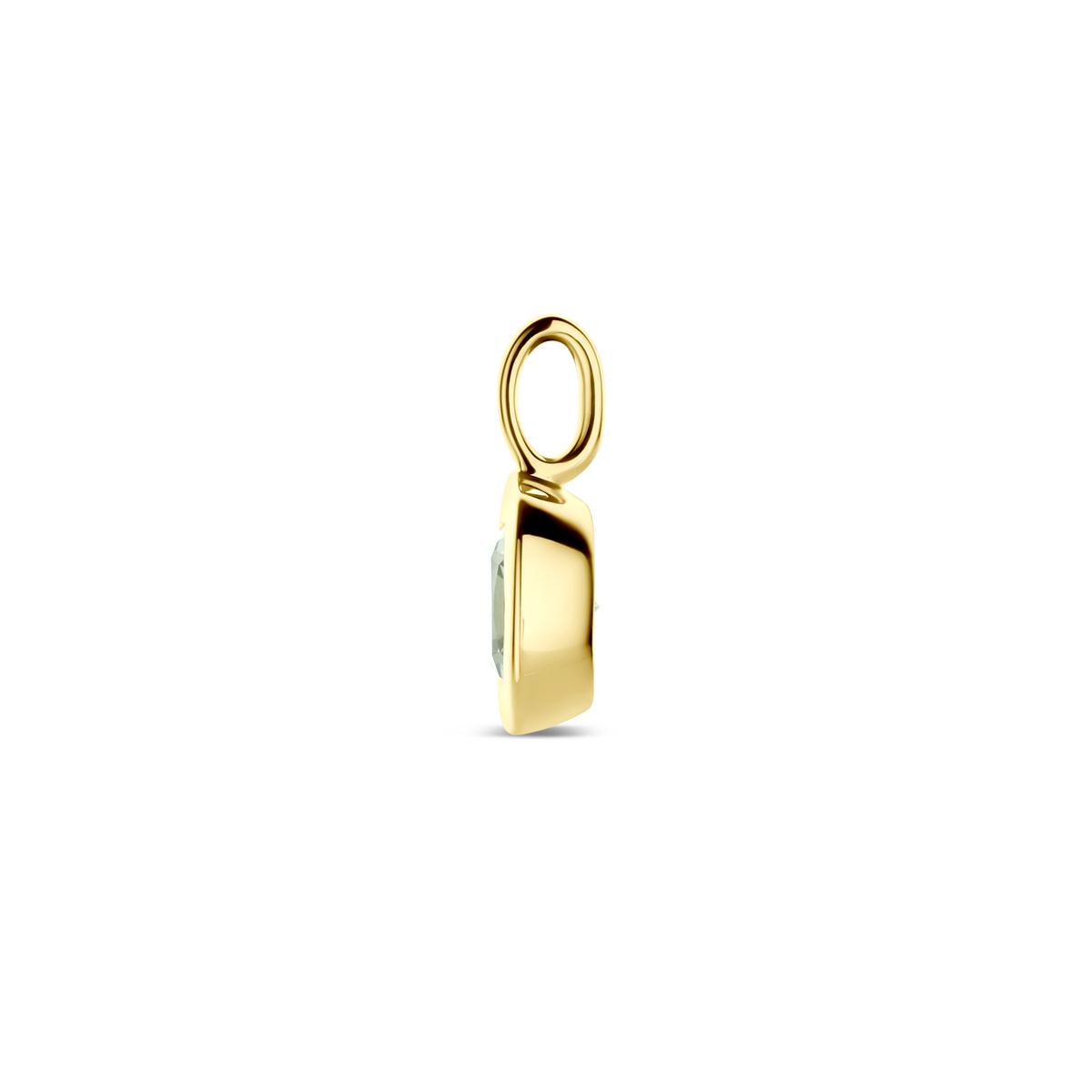 14k Geelgouden hanger uitgevoerd met groene amethist. De hanger heeft een totale hoogte van 14mm.