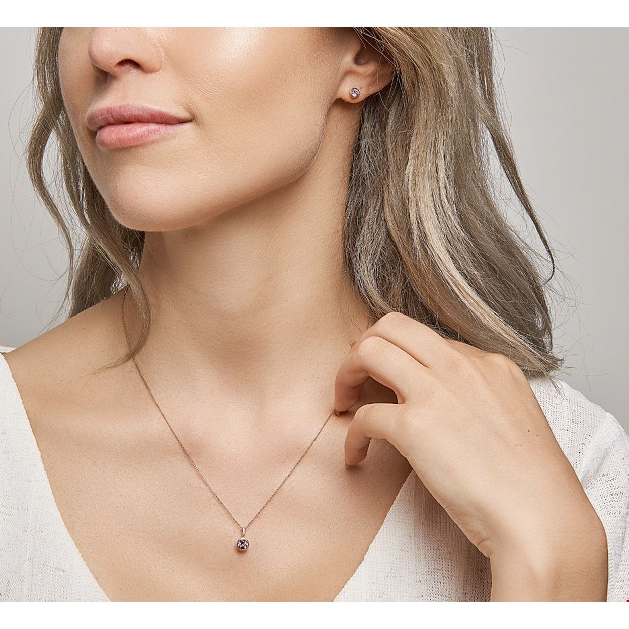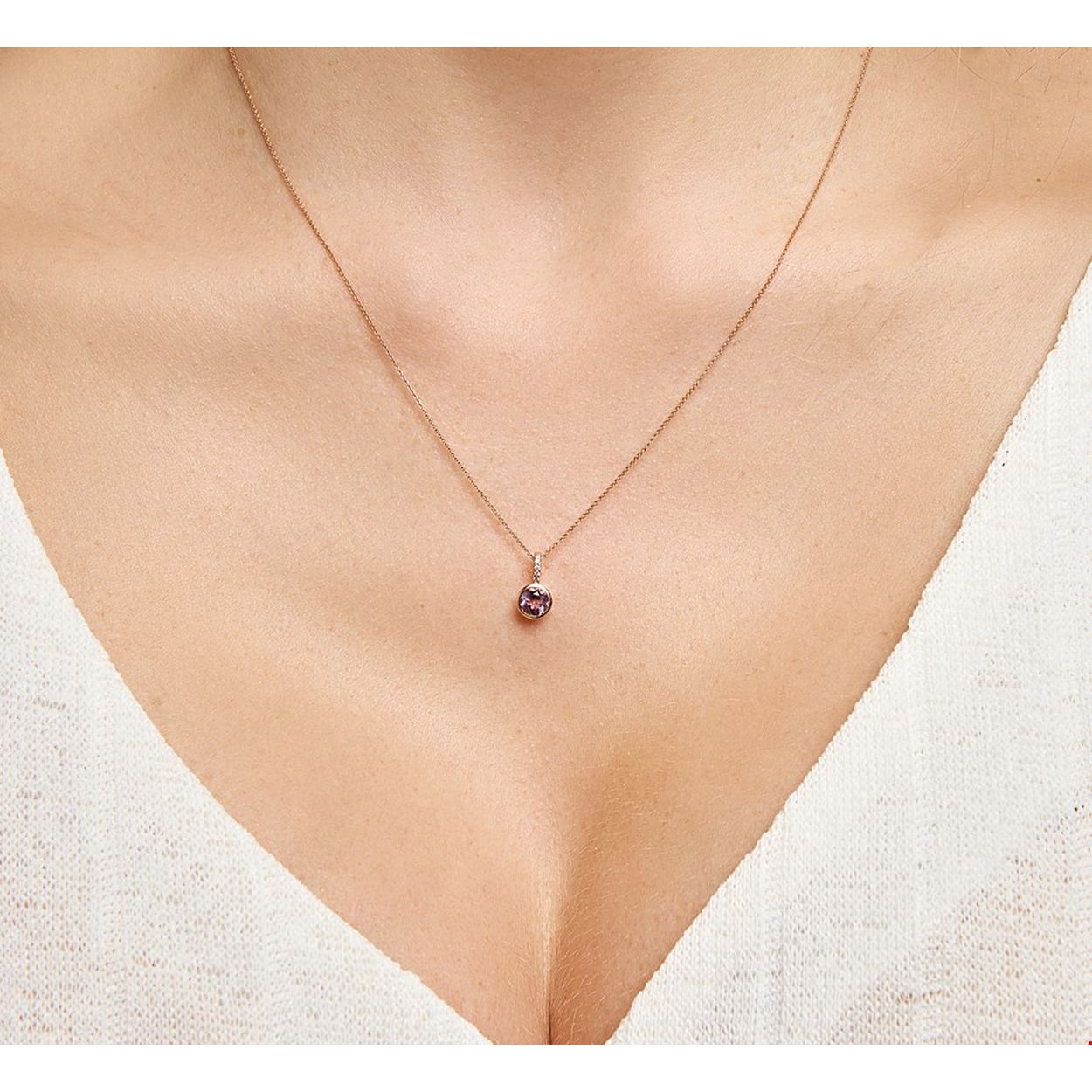 Beschrijving: 14k Rosegouden hanger uitgevoerd met schitterende amethyst en een diamant rij. De hanger heeft een totale hoogte van 11.5mm.