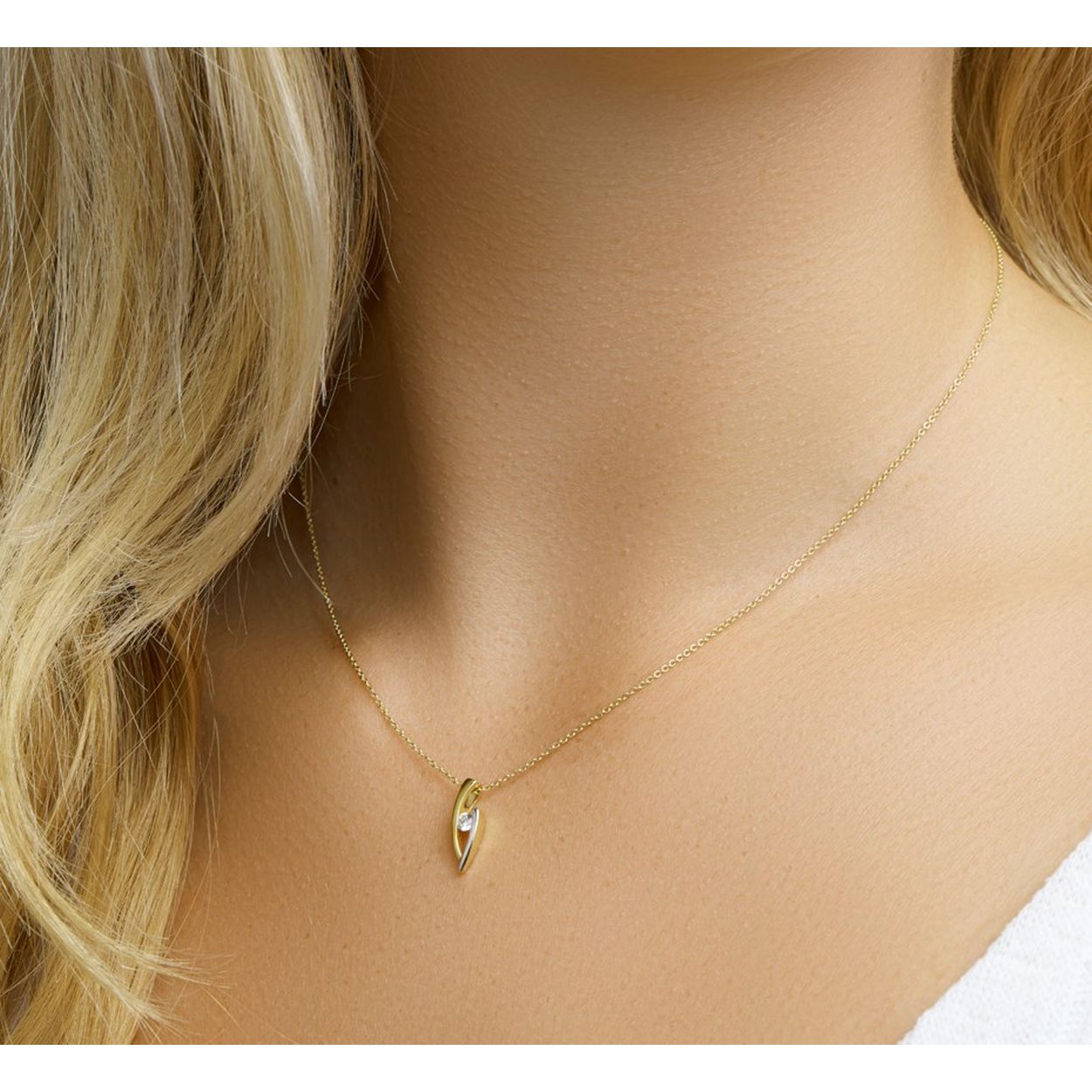 14k Geelgouden hanger uitgevoerd met een heldere zirkonia. De hanger is bicolor gestift en heeft een afmeting van 15.5x5mm.