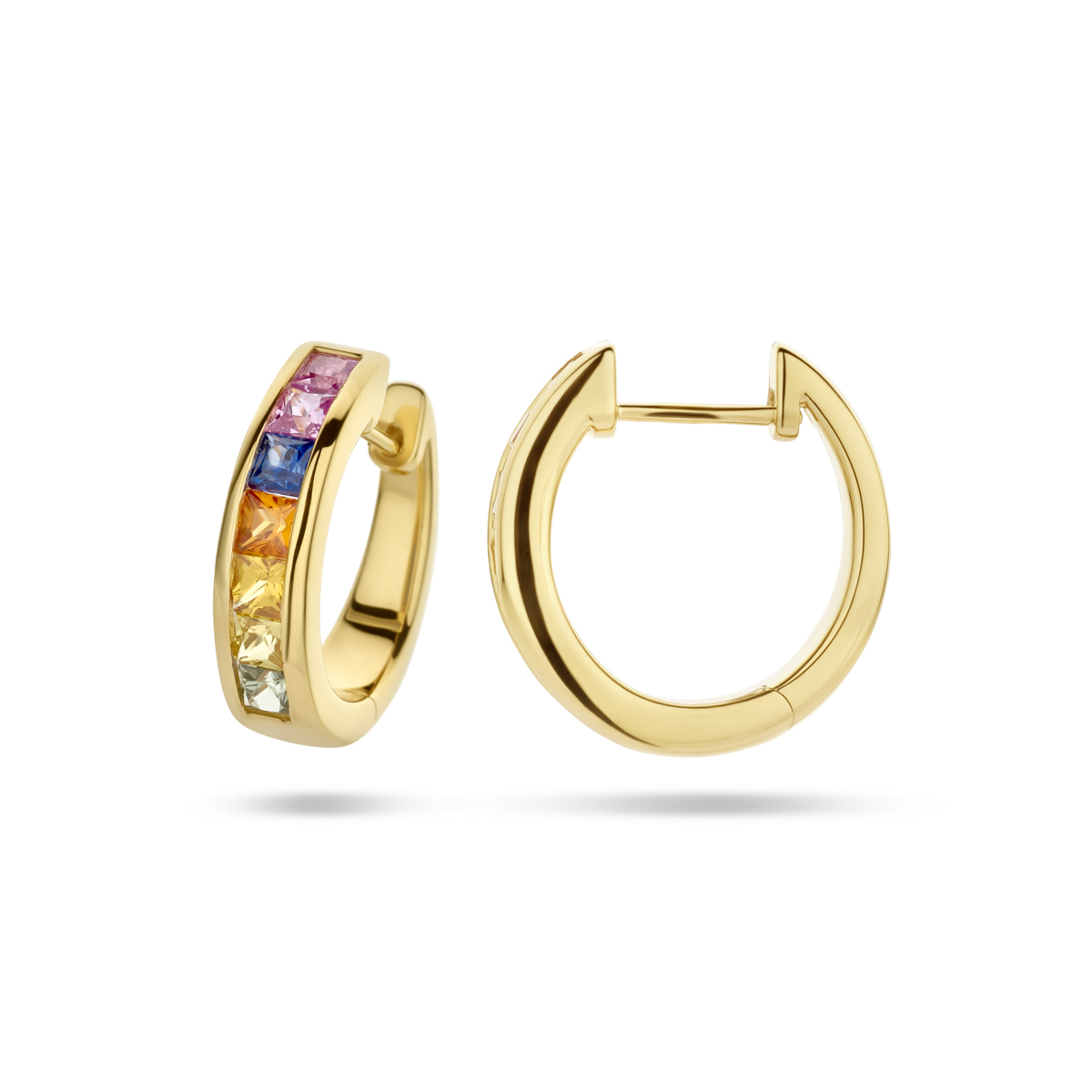 14k Geelgouden klapoorringen uitgevoerd met saffier in verschillende kleuren. De oorringen hebben  een afmeting van 16x4mm.