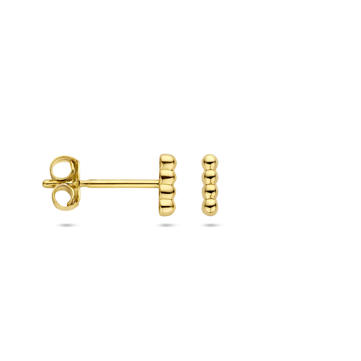 14k Geelgouden oorknoppen in de vorm van een balkje uitgevoerd met bolletjes. De oorknoppen hebben een afmeting van 5x1.4mm.