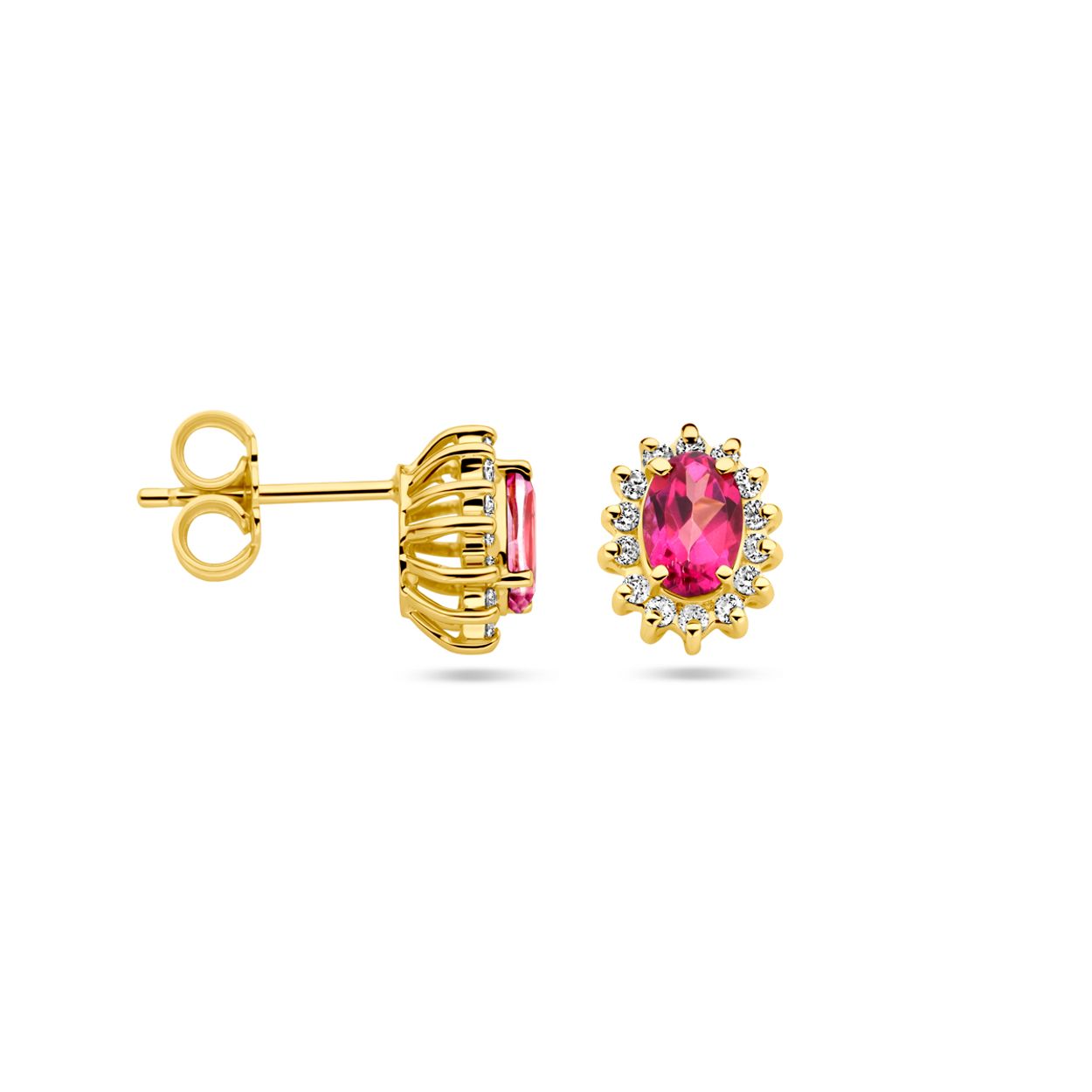 14k Geelgouden oorknoppen uitgevoerd met roze topaas en diamant. De oorknoppen hebben een afmeting van 9.5x7.5mm. Het diamantgewicht is 0.22ct.