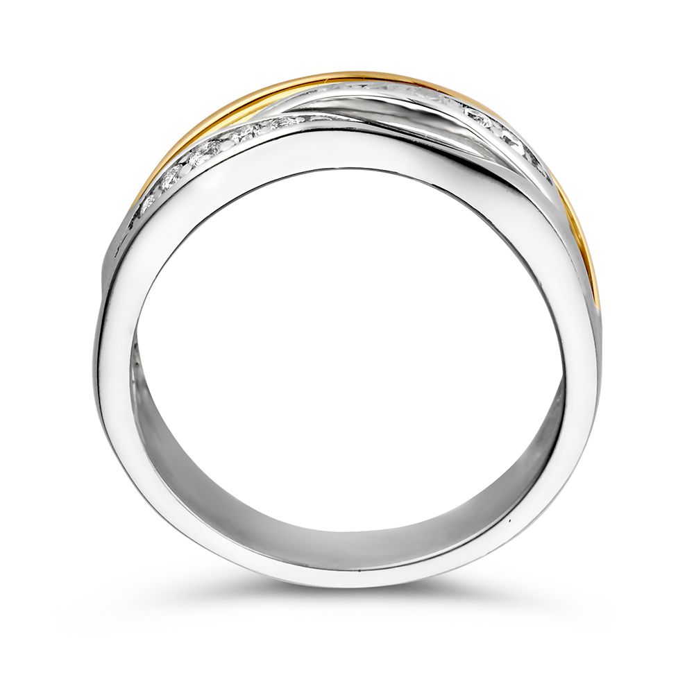 De Ring zilver/goud zirkonia Maat 58, model RF627126-58, is een elegante ring gemaakt van goud, voorzien van een witte zirkonia steen. Het heeft een gewicht van 0,8 gram, een breedte van 8 mm en een diameter van 58 mm. Draag deze sprankelende ring solo voor een verfijnde look of combineer met andere sieraden voor extra glamour.