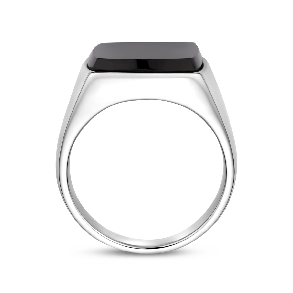 Gerhodineerd 925 zilveren zegelring uitgevoerd met onyx. De ring heeft een breedte van 16mm.